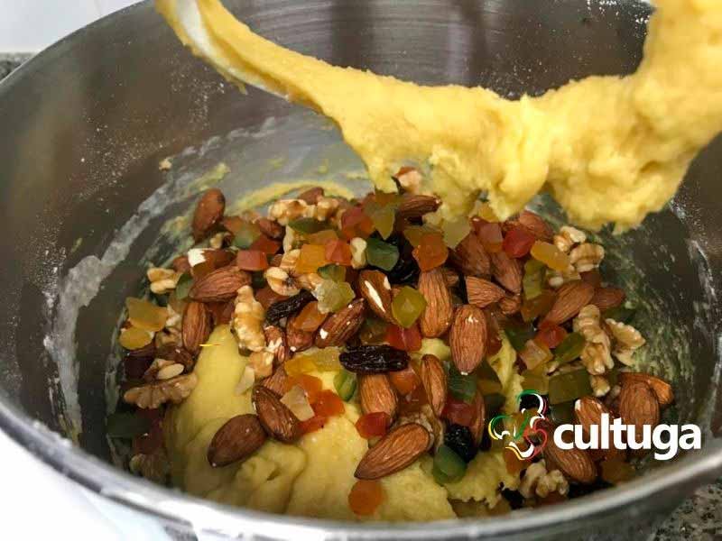 5. Envolva as frutas cristalizadas, as frutas secas e os frutos secos a massa e deixe descansar por 10 minutos na própria batedeira: