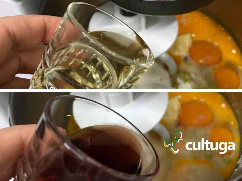 3. Acrescente o vinho do Porto e a aguardente a massa: